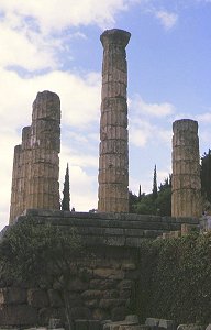 Einst bestand er unter anderem aus 38 dorischen Säulen. Nach verschiedenen Zerstörungen durch Erdbeben sind vom Apollon-Tempel von Delphi nur noch Reste erhalten. Fünf der größten Säulen-Fragmente hat man an dieser Stelle wieder errichtet.